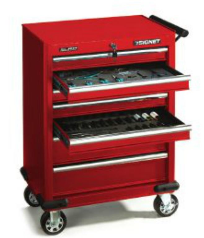 ארונות/עגלות 7 מגירות מאובזרות הכוללת 168 כלים ב- 9 מגשים ופטיש אויר "1/2 ורצ'ט אויר "1/2, רוחב כללי: 675 מ"מ, עומק כללי 460מ"מ, גובה כללי:1000מ"מ כולל גלגלים, משקל:55 ק"ג, בצבעים: שחור/אדום/כחול, מקטים: 054305-054307 SIGNET