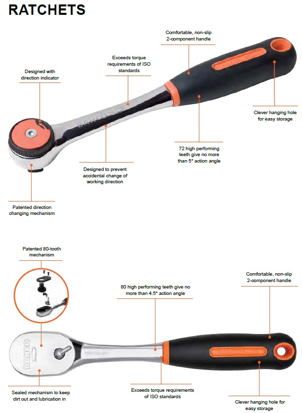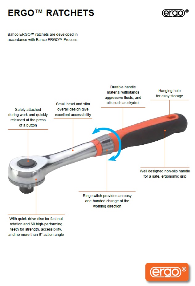 בשיתוף פעולה של ידע ופיתוח עם מומחים לארגונומיה מהמובילים בעולם , Bahco פיתחה את המגוון המיוחד של ERGOTM ratchets למצבי עבודה ודרישות התובעניות ביותר.