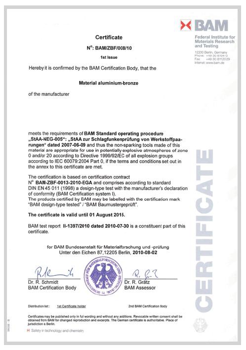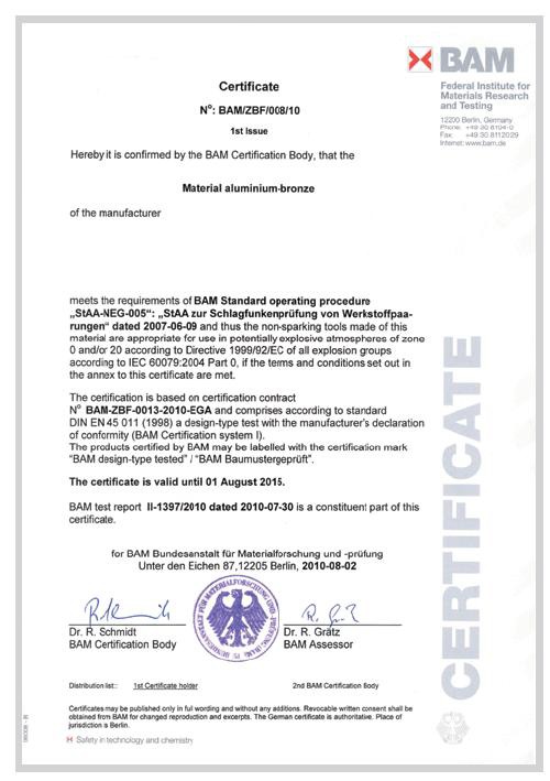 - החומרים שאינם יוצרים ניצוצות של באקו מאושרים על ידי BAM (המכון הגרמני הפדראלי לחקר חומרים)