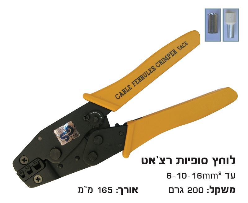 לוחץ סופיות רצ'ט, תחום עבודה:עד 6-10-6mm², במשקל: 200 גרם, באורך 165מ"מ, מקט: YAC-6