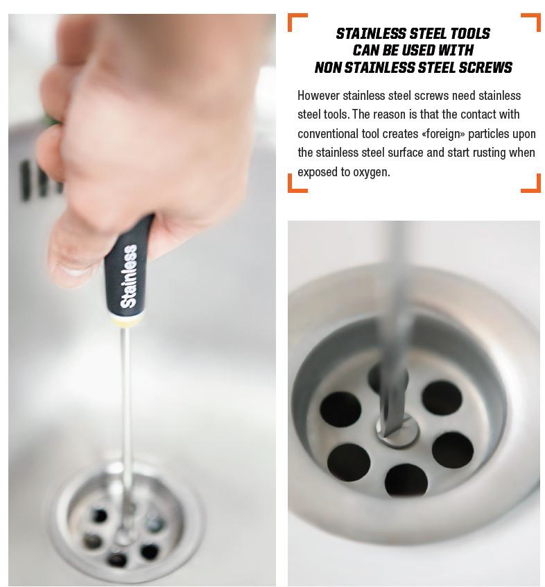 יחד עם זאת, ברגים מפלדת אלחלד- נירוסטה מצריכים כלים מפלדת אלחלד -נירוסטה. הסיבה לכך היא שהמגע עם כלי קונבנציונלי יוצר חלקיקים זרים במשטח פלדת האלחלד- נירוסטה , והם מתחילים להחליד עם החשיפה לחמצן.