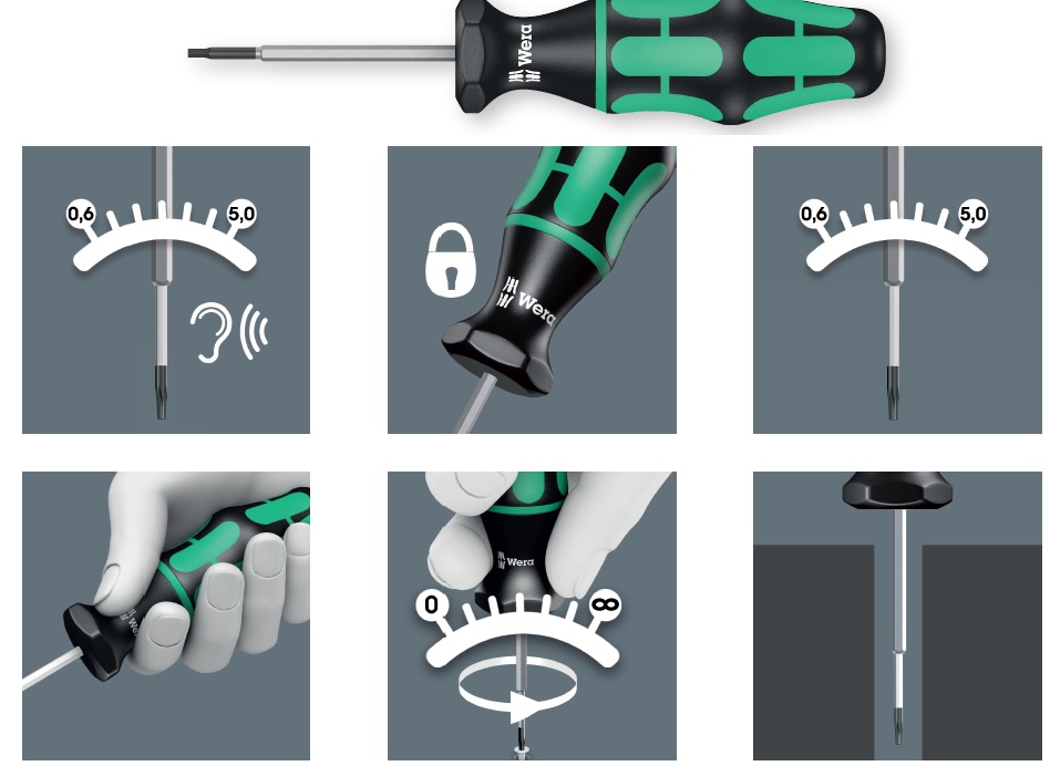 כלי המומנט של Wera מציעים הידוק בורג עם בקרת מומנט כדי למנוע נזק לבורג ולחלק, וכדי להבטיח את