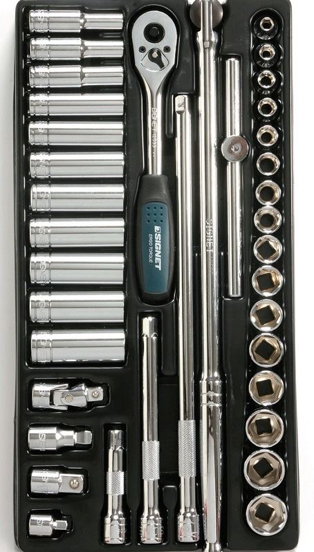 סט בוקסות "3/8 מעורב 37 י"ח מידות מגש צר:190x380 מ"מ, קצר:6,7,8,9,10,11,12,13,14,15,16,17,18,19,20,21 עמוקות:,8,9,10,11,12,13,14,15,16,17,18,19 ידית רצ'ט פלסטי,ידית T, ידית ברך 3/8-15 ,מעבר ז.1/2,נ.3/8,מעבר ז.1/4,נ.3/8 ,פרק אוניברסלי מאריך 3",מאריך 6",מאריך 12" מקט:055515 SIGNET