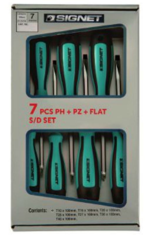 סט מברגים 7 יחידות, שטוח: 5-100,6-150,8-150, פיליפס: PH1-80,PH2-100, פוזידרייב: PZ1-80, PZ2-100, מקט: 052474 SIGNET