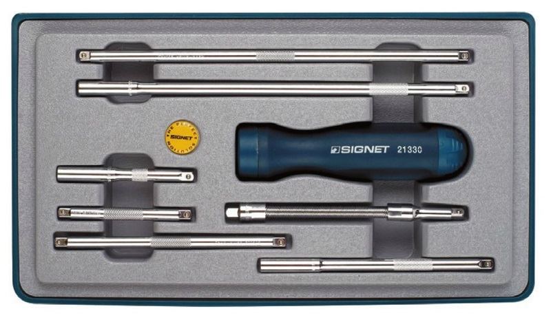 סט מברג רצט 8 י"ח,3 מאריכים לביטים: 3",6",10", 3 מאריכים לבוקסות: 2.5,6,1/4, 1 מאריך גמיש לבוקסה 1/4, מקט:021381 SIGNET