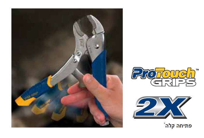 הכלים הננעלים עם שחרור מהיר VISE GRIP החדשים של IRWIN מאפשרים שחרור ביד אחת ללא הדק, ולכן קל יותר פי שניים לפתוח אותם מאשר העיצוב הקודם. מאחזי PROTOUCH לא מחליקים, מונעי צביטה מבטיחים נוחות, שליטה ופחות עייפות בידיים.