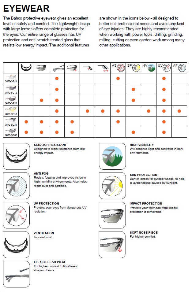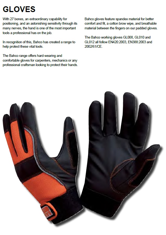 מגוון ציוד המגן של Bahco מורכב מכפפות הגנה חיוניות ומשקפיים הנועדים להגנה אישית אופטימלית בסביבת העבודה שלך. הדגש הושם על הגנה על הידיים והעיניים , מכיוון שהם בדרך כלל מהווים את הסיכון הגבוה ביותר להיפגע מגרימת נזק כול שהוא עם השלכות חמורות באם אינם מוגנים כראוי. במגוון הכפפות ומשקפי הבטיחות של Bahco, קיימות וריאציות שונות שפותחו כדי שיתאימו לסביבה ליישומים ולמידות בגדלים השונים של העובדים. המוצרים פותחו באמצעות מערכת יחסים של עבודה קרובה עם המשתמשים הסופיים והמקצועיים בכדי לעזור להמשיך לפתח ולהוסיף תכונות ודרישות חדשות מהשטח שתורמות לבטיחות משופרת ונוחות בעבודה.
