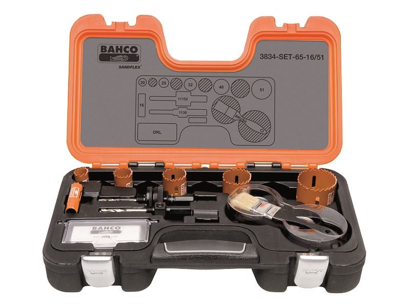 סט משור / מסורי/ מקדחי משור / משור / מסור / משור / מסורי כוס לעץ/למתכת במארז פלסטיק קשיח כולל משור / מסורי/מקדחי כוס במידות: 16,20,25,32,40,51 מ"מ + אביזרים • סט משור / מסורי/משור / משור / מסור / משור / מסורי כוס בי-מטאל Sandflex הכולל גדלים פופולריים בתעשיית ההנדסה, המים והסניטציה, ותעשיית התקנות החשמל BAHCO