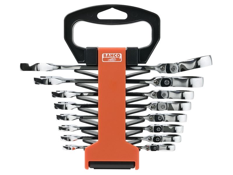 סט של מפתחות רינג פתוח רצ'ט / קומבינציה עם ראש מסתובב מידות : 8,10.11.12.13.14.17.19 אריזה: מחזיק מפלסטיק מקט:41RM/SH8,יצרן:BAHCO
