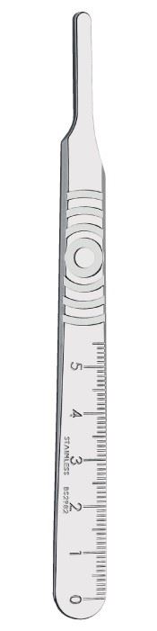 Stainless Steel Handles with a measure or graduation on the reverse side to assist with training, marking of the correct surgical site and trauma injury investigations. Fitment No.4. for Blades - including No.18, 19, 20, 21, 22, 22A, 23, 24, 25, 25A, 26, 27 and 36. Individually wrapped and boxed in units of 10