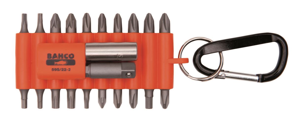 22 pce rubber holder: 20 bits, 1 universal magnetic bit holder and 1 socket adaptor 1/4",In a hanging cardboard sleeve,Drive: 1/4" DIN 3126-C6.3,ISO 1173,Finish: Zinc phosphate,Material: High performance alloy steel.