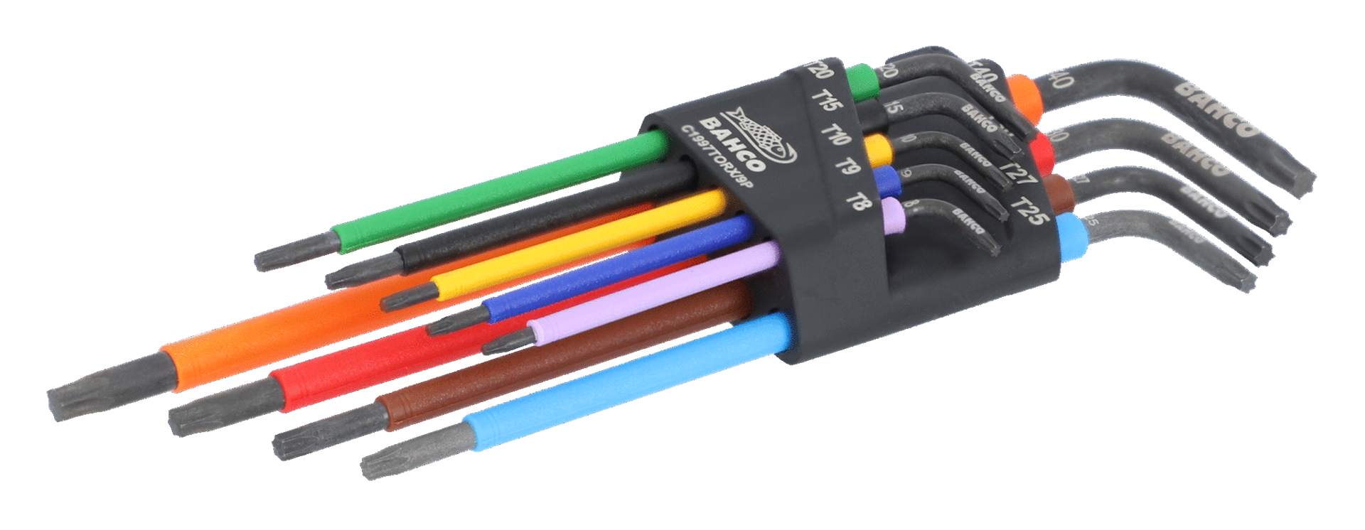 סט מפתח טורקס כוכב צבעוני ארוך במידות :T8, T9, T10, T15, T20, T25, T27, T30, T40 פונקציית התאמה קלה: מוחזק היטב וקל מאוד להוציא ולהכניס את המפתחות הודות למערכת התאמה בלעדית בתפס הפלסטיק ובזכות הזיהוי הקל של צבע לפי גודל, אחיזה נעימה, מונעת החלקה ועמידה בשמן גימור פוספט: הגנה מפני קורוזיה, מתן אורך חיים ארוך. מיוצר מפלדה באיכות גבוהה, מוקשה לחלוטין ובעל זרוע ארוכה מספקת העברת מומנט ונגישות גבוהים יותר.זיהוי מידה מסומן בלייזר ובכך עמיד בפני שחיקה לנגישות מהירה לכל מידה BAHCO