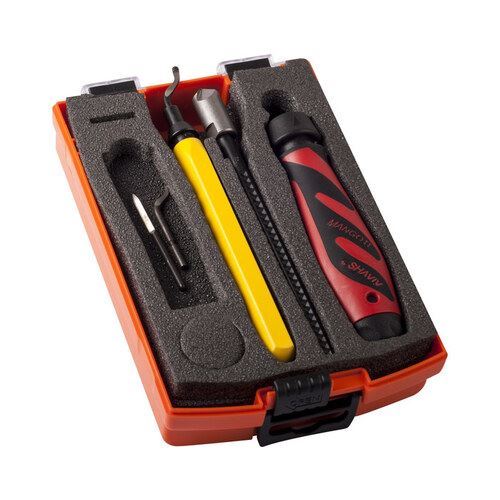קיט שבר ולהבים מיוחד לחשמלאים ומאפשר לבצע עבודות גימור בתעלות של כבילה , צינורות מוליכי כבלים , במתכת , פלסטיק ונחושת . הערכה כוללת : ידית ארגונומית ליישומים סטנדרטיים וכבדים בעל F שקיעת שטיפה פנימית של F12 לקצוות חור מגוזרים בקוטר של עד 12 מ"מ (0.47 ") ידית MB200 להב להחלפה E100 להב E111 לביצוע חורים דקים בקוטר של 1.5 מ"מ (0.06 אינץ ') מגרד E400. Vargus מכיל 2 ידיות + מאריך + 3 להבים + שקען . מתאים ל - PVC ונחושת