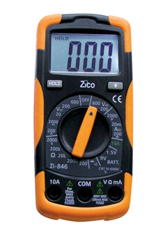תחום ידני יציקה כפולה מבנה בטיחותי החזקת נתונים תאורת מסך מפרט טכני מתח AC עד 600V מתח DC עד 600V התנגדות עד 2mΩ זרם DC עד 10A בדיקת דיודה בדיקת רציפות מידות (גובה x רוחב x עומק): 138x66x38 מ''מ משקל: 208 גרם אביזרים: חוטי מדידה סוללה 9V ZICO