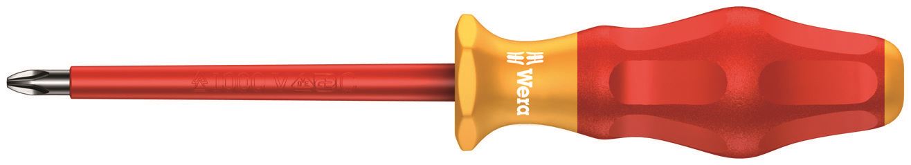 מברג מחורץ מבודד 1162 i PH VDE לבורגי פיליפס, יישום: בורגי פיליפס, להב: מבודד, נבדק באופן פרטני על פי IEC 60900:2004 עיצוב:מצופה כרום,קצה שחור, ידית: Kraftform עם מאפיין מונע סיבוב, רב קומפוננטי WERA