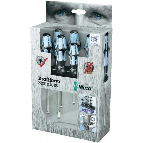 סט מברגים פלדת אלחלד ומתקן תליה WERA, יישום: ברגים מחורצים, פיליפס ופוזידרייב, תכולה: סט 6 חלקים ומתקן תליה בקטון תצוגה. 3350 PH 1 x PH 1x80; 1 x PH 2x100;3335 1 x 0,5x3,0x80; 1 x 0,8x4,0x100; 1 x 1,0x5,5x125;3334 1 x 1,2x6,5x150;