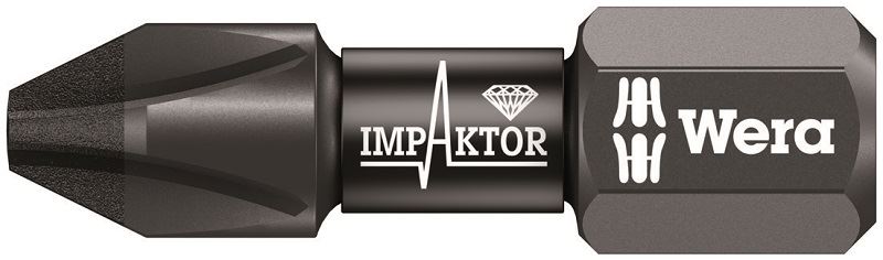 ביטים Impaktor 851/1 IMP DC יישום:בורגי פיליפס, מוביל: משושה 1/4", מתאים למחזיקי ביט DIN 3126-D 6.3 , ISO 1173. עיצוב: טכנולוגית Impaktor מבטיחה אורך חיי שירות מעל הממוצע גם בתנאים קיצוניים הודות לניצול מיטבי של מאפייני החומר וגיאומטריה מתוכננת באופן אופטימלי, המתאימה במיוחד לשימוש עם מברות אימפקט קונבנציונליות, ציפוי היהלום המחוספס מקטין את החשש להחלקת ראש הבורג החוצה בשל התנגדות טובה יותר לחיכוך. WERA