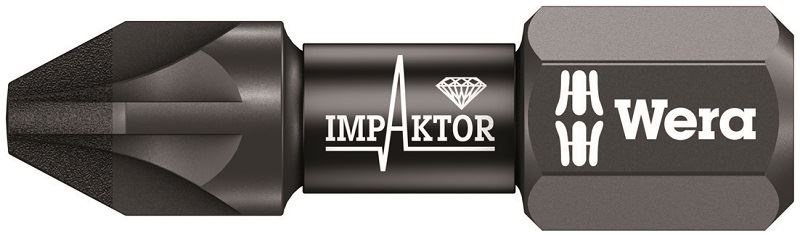 ביטים 855/1 IMP DC Impaktor יישום: מתאים לבורגי פוזידרייב, מוביל: משושה 1/4", מתאים למחזיקי ביט DIN 3126-D 6.3 , ISO 1173, עיצוב: טכנולוגית Impaktor מבטיחה אורך חיי שירות מעל הממוצע גם בתנאים קיצוניים הודות לניצול מיטבי של מאפייני החומר וגיאומטריה מתוכננת באופן אופטימלי, המתאימה במיוחד לשימוש עם מברגות אימפקט קונבנציונליות. ציפוי היהלום המחוספס מקטין את החשש להחלקת ראש הבורג החוצה בשל התנגדות טובה יותר לחיכוך. WERA
