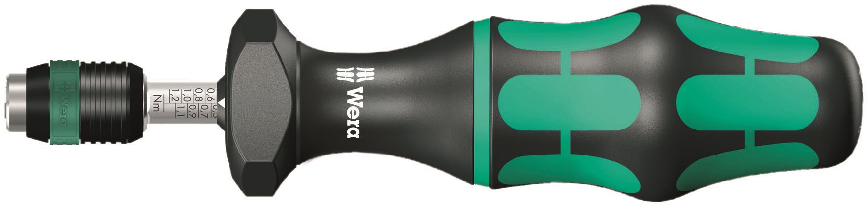 סדרה 7400, מברג מומנט מתכוונן Kraftform עם תפסנית שחרור מהיר Rapidaptor. יישום:מתאים לביטים עם כניסה משושה DIN 3126-C 6.3 "1/4, ו- E 6.3 (ISO 1173) וסדרת ורה 1 ו - 4. עיצוב:Rapidaptor נכנס במהירות, יוצא במהירות, מסתובב במהירות, תופס הכל, טכנולוגית יד אחת. דיוק: +-6% (EN ISO 6789), סקלה נומרית של ערך המומנט. שומעים "קליק" כאשר עוברים את העומס שנקבע. ידית: Kraftform עם מאפיין מונע גלגול, רב קומפוננטית (מד מומנט , מפתח מומנט , ידית מומנט , טורקמטר)WERA