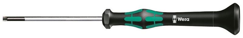 מברג 2067 TORX BO ליישומי אלקטרוניקה, יישום: בורגי שקע TORX עם פין בטיחות (BO=עם קדח) , להב: עגול, עיצוב:קדח בחתך TORX, ציפוי כרום, קצה שחור, ידית: Kraftform Micro עם מאפיין מונע סיבוב וכיפת סיבוב, מרובה רכיבים WERA