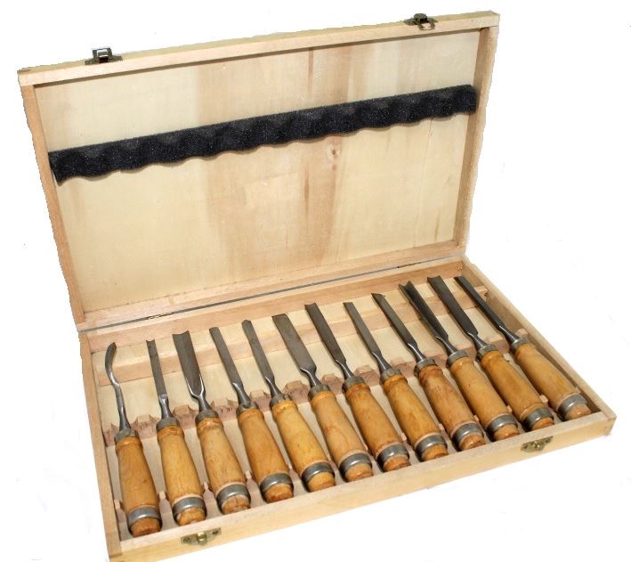 סט מפסלות גילוף וחריטה בעץ 12 י"ח במארז עץ איכותי