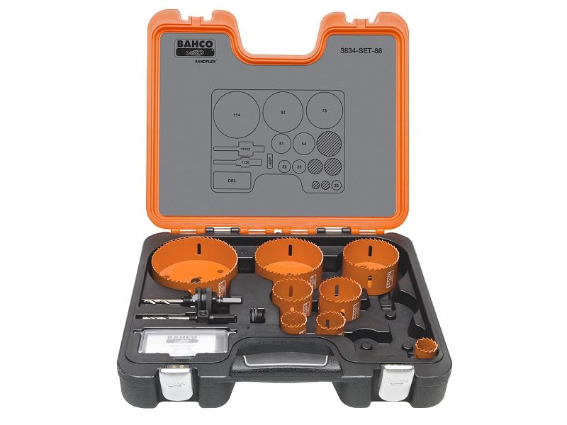 סט משור / מסורי/ מקדחי כוס משור / משור / מסור / משור / מסורי לעץ/למתכת במארז פלסטיק קשיח כולל משור / מסורי/מקדחי כוס במידות: 25,32,35,51,54,76,92,114 מ"מ + אביזרים • סט משור / משור / מסור / משור / מסורי כוס בי-מטאל Sandflex הכולל גדלים פופולריים בתעשיית ההנדסה, המים והסניטציה, ותעשיית התקנות החשמלBAHCO