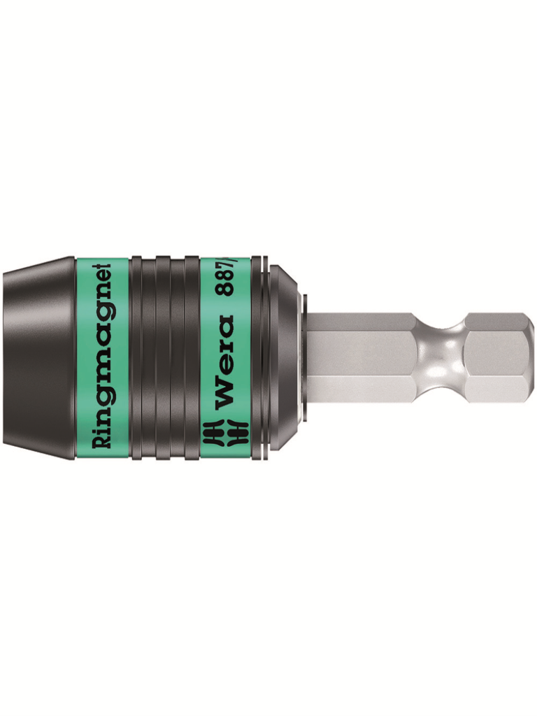 | Rapidaptor universal holder for bits with hexagon head drive as per DIN ISO 1173-C 6.3 and E 6.3 (ISO 1173). The floating, free-turning magnetic sleeve securely holds even large and heavy screws. The Rapidaptor allows bits to be attached without any need to actuate the sleeve. The removal of the bit is simple, just by pushing the sleeve forward. This enables rapid bit change with just one hand. 1/4" hexagonal, suitable for power screwdrivers with take-up as per DIN ISO 1173-F 6.3. |