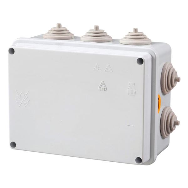 קופסת חיבור דגם D-24 בצבע אפור, בגודל 154x114x70 מ"מ. היא מיועדת להתקנה חיצונית על הטיח ומגיעה עם דרגת אטימות IP55. הקופסה עשויה מחומר פוליקרבונט ומיוצרת בישראל על ידי המותג עדא פלאסט.