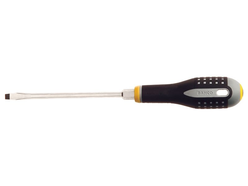 מברג אשר פותח על פי תהליך ERGO מדעי מברג לברגים עם ראש מחורץ . ידית: ידית עשויה משלושה רכיבים, למקסום נוחות המשתמש והעברת הכוח קל לבחור בקצה הנכון, הודות לידית עם קוד הצבע והסמל המוטבע על קצה הכיפה להב: פלדת סגסוגת עם רמת ביצועים גבוהה. ציפוי כרום והקשיה מלאה. גימור שחור של הקצה לשיפור הדיוק. ISO 2380 / DIN 5264 להב עם פרופיל משושה ובליטה לסיבוב בסיוע מפתח ברגים מקטים:BE-8158-BE-8890 ,יצרן:BAHCO