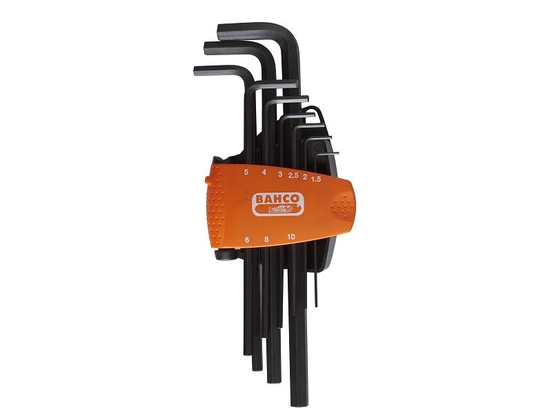 סט של מפתחות אלן ארוכים בתפס פלסטיק משושים עם גימור שחור, 8 חלקים, מטרי מחזיק קומפקטי עשוי 2 רכיבים המאפשר הרחקה בקלות של מפתחות כל הגדלים מסומנים על המחזיק כדי להבטיח בחירה בקלות חור לתלייה מקט:BE-9588,יצרן:BAHCO