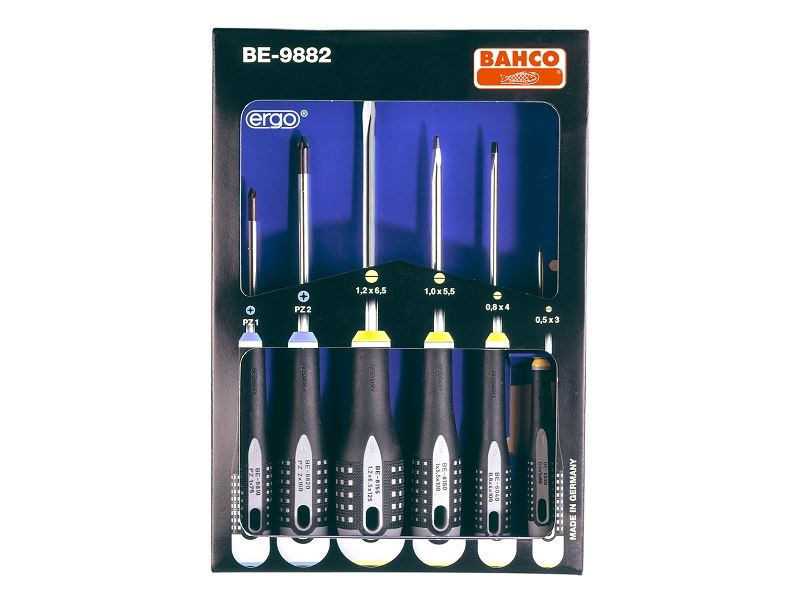 סט מברגים מבודדים ERGO, 6 חלקים לברגים עם ראש מחורץ ו-Pozidriv בקופסת קרטון . מקט:BE-9882 ,יצרן:BAHCO