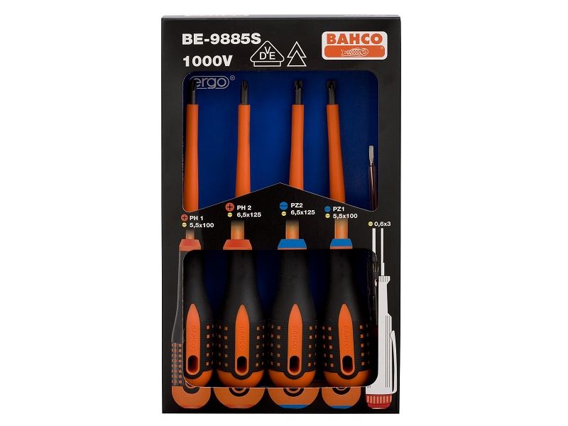 סט מברגים מבודדים קומבינציה, ERGO, 4 חלקים (8 קצוות שונים) ובודק מתח (טסטר) לברגים עם ראש מחורץ, פיליפס ו-Pozidriv בקופסת קרטון . מקט:BE-9885S ,יצרן:BAHCO