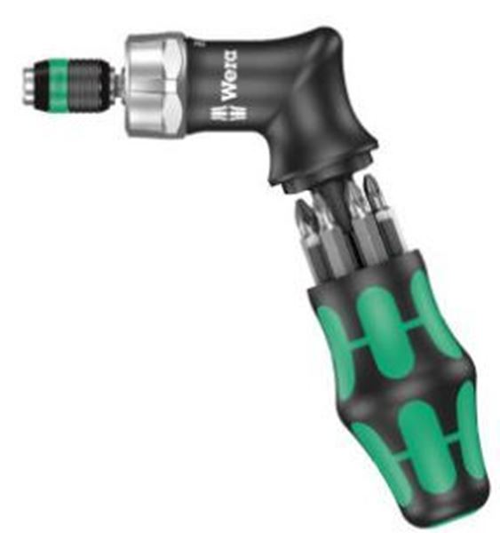 KK PISTOL - מברג רצ'ט זויתי עם חיבור 1/4" לביטים כולל 6 ביטים במחסנית בידית המברג WERA:814 RA 1 x 1/4";851/1 Z PH 1 x PH 1x25; 1 x PH 2x25;855/1 Z PZ 1 x PZ 1x25; 1 x PZ 2x25;867/1 TORX® 1 x TX 20x25; 1 x TX 25x25;