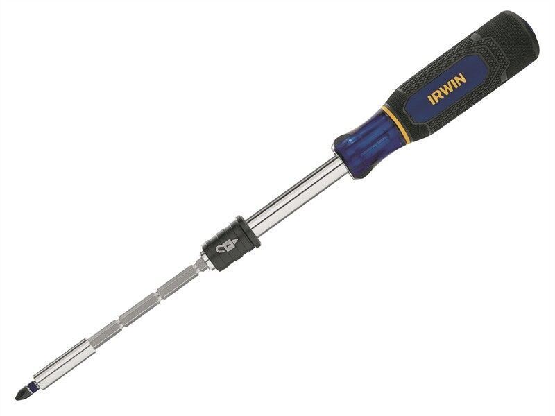 The IRWIN® 5-in-1 Extending Screwdriver extends from 125mm to 280mm (5" to 11"), locking securely at each 25mm (1") increment. This innovative driver provides 7 different lengths in total making quick work of jobs that require a variety of screwdriver lengths – especially those in hard-to-reach spaces. The screwdriver also features a durable acetate handle with a 3-Zone Comfort Grip to maximise performance and increase comfort in high and low torque applications. Plus, this driver has an integrated bit holder that accepts insert and power bits for convenient replacement and includes 5 fastener bits featuring precision tip geometry for superior fitment on fasteners, reducing stripping and cam out. Bit sizes included are PH2, PZ1, PZ2, SL5-6 and T20.