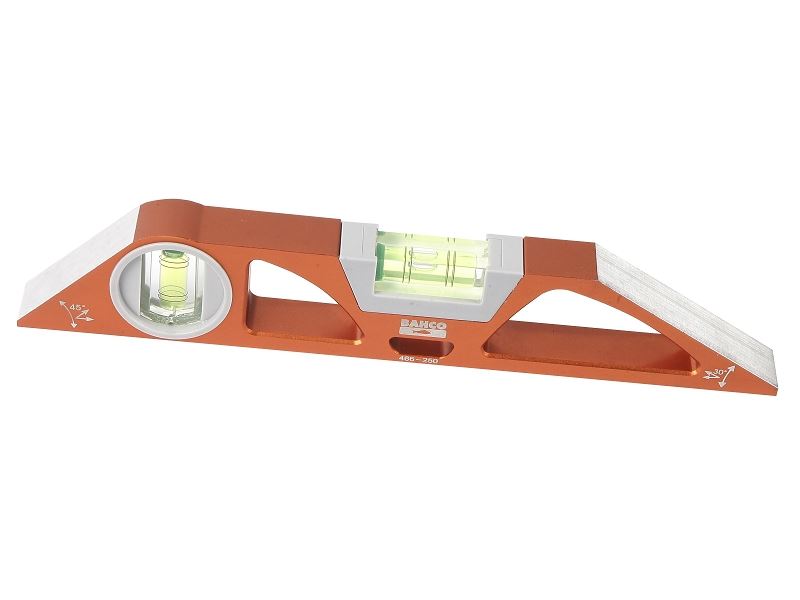 פלס פיגומים מאלומיניום באורך 250 מ"מ, עם זווית של 45 ו-30 מעלות, מוגדרת מראש, לקביעת זווית מהירה דיוק גבוה עם דיוק של ± 0.5 מ"מ למטר בסיס מגנטי עשוי מתכת נדירה ומשטחים מעובדים עיצוב מסגרת פתוחה, המאפשר לשנע את הכלי בקלות רבה מקט:466-250,יצרן:BAHCO