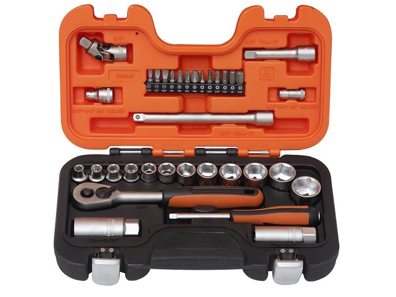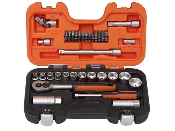 • סט בוקסות "1/4 ו-"3/8 • מארז: פוליאתילן בצפיפות גבוהה (HDPE) • סגסוגת פלדה לרמת ביצועים גבוהה • גימור מט • ISO 1174 • DIN 3120 • תכולה, 34 חלקים o בוקסות משושות "3/8: 1/4”, 5/16”, 11/32”, 3/8”, 7/16”, 1/2”, 9/16”, 5/8”, 11/16”, 3/4”, 13/16”, 7/8”, 12 חלקים o חלק אחד רטצ'ט שחרור מהיר "3/8, 60 שיניים/זווית פעולה 6° o מוטות הארכה "3/8, 75 מ"מ/"3 ו-150 מ"מ/"6, 2 חלקים o חלק אחד מחבר אוניברסלי "3/8 o חלק אחד מחזיק ביט "3/8 x "1/4 o בוקסות לפלגים משושות: 16 מ"מ ("5/8), 21 מ"מ ("13/16), 2 חלקים o חלק 1 מפתח עם ידית 2-רכיבים o חלק אחד מחזיק ביט "1/4 x "1/4 o ביטים "1/4: מחורצים 4, 5.5, 7 מ"מ, 3 חלקים o ביטים "1/4: PH 1, 2, 3, 4,, 4 חלקים o ביטים "1/4: משושה 3, 4, 5, 6, 7, 8 מ"מ, 6 חלקים מקט:S330AF ,יצרן:BAHCO