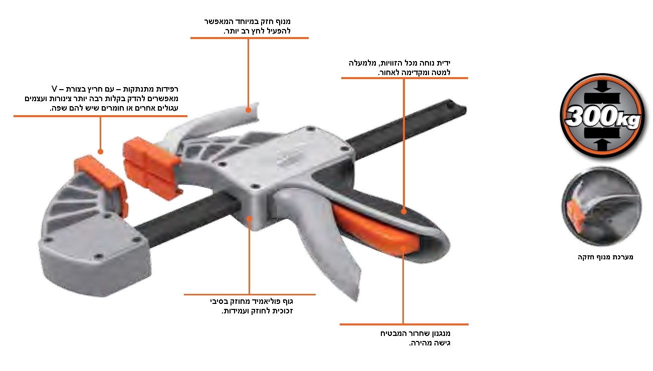 קלמרה/קליבה זו פותחה להידוק יומיומי והיא מעט קטנה יותר משאר משפחת המוצרים הזו. קל להפוך את סדרה QCB לקליבות – פשוט השתמש בכפתור הקליבה הכתום כדי לעבור ללחי ההידוק הקטנה. אפשר להדק חלק בגודל של עד 300 מ"מ.