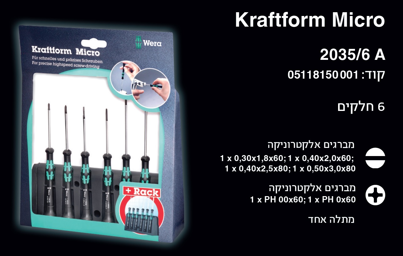 Kraftform Micro הוא שותף אידיאלי לפעולות הברגה ביישומים הנדסיים מדויקים או אלקטרוניים. איכות הייצור המדויקת ביותר של Wera היא חיונית כאשר עוסקים במידות מינימליות. העיקרון של שלושה אזורים מפחית את זמן ההידוק ומוריד באופן משמעותי את העלות של כל חיבור בורג.